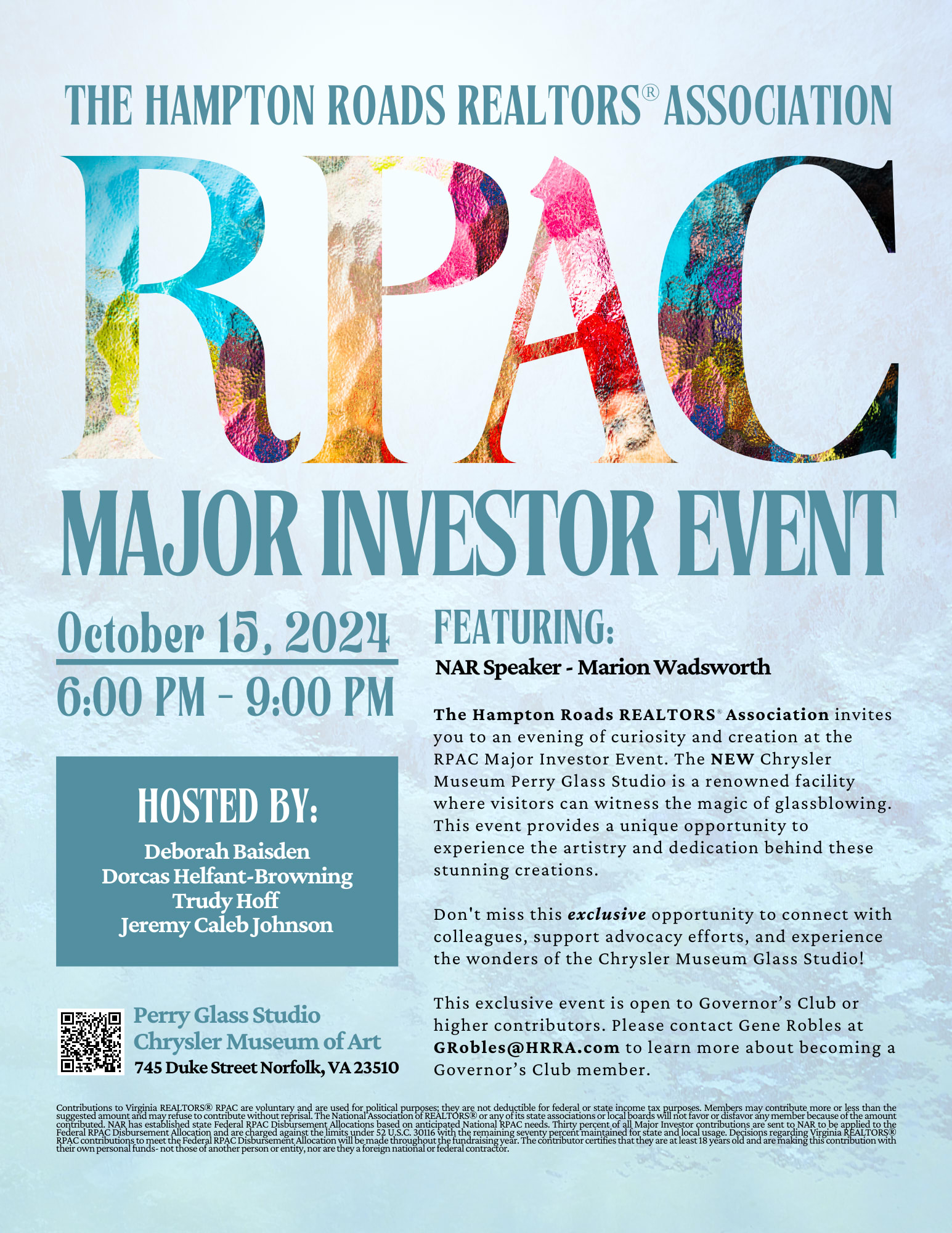 The Hampton Roads REALTORS® Association invites you to an evening of curiosity and creation at the RPAC Major Investor Event. The NEW Chrysler Museum Perry Glass Studio is a renowned facility where visitors can witness the magic of glassblowing. This event provides a unique opportunity to experience the artistry and dedication behind these stunning creations. Don't miss this exclusive opportunity to connect with colleagues, support advocacy efforts, and experience the wonders of the Chrysler Museum Glass Studio! This exclusive event is open to Governor’s Club or higher contributors. Please contact Gene Robles at GRobles@HRRA.com to learn more about becoming a Governor’s Club member.